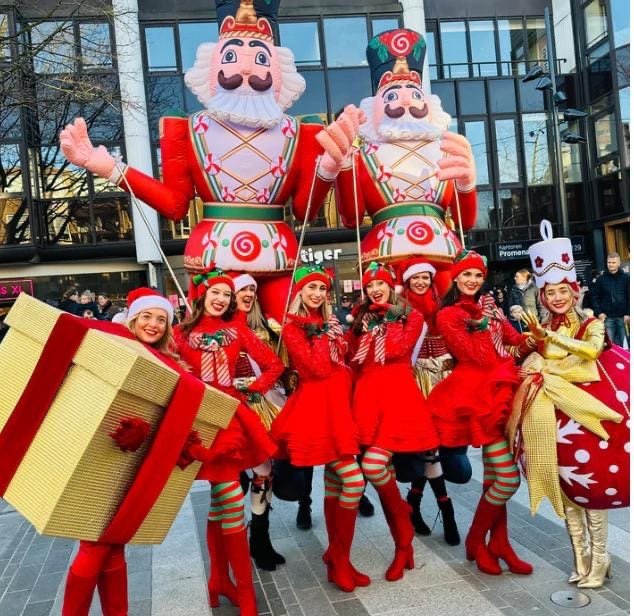 Laat je meevoeren door de magie van onze schitterende kerstparade! Sierlijke danseressen bewegen synchroon op vrolijke kerstmuziek, terwijl de levende kerstbal en het levende cadeau met het publiek dansen en knuffels uitdelen. De parade wordt afgesloten door twee indrukwekkende notenkrakers van wel 3,5 meter hoog, een adembenemend hoogtepunt van dit gezellige kerstfeest!