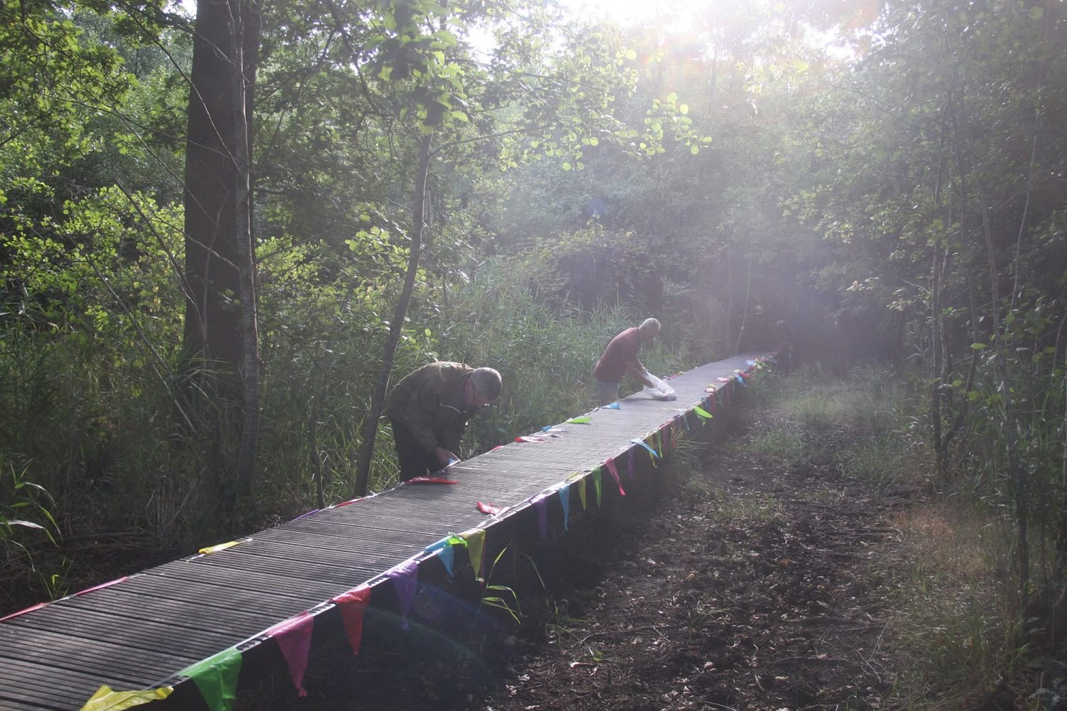 Samen met de boswachters van Staatsbosbeheer zorgden de vrijwilligers van het MEC Etten-Leur dat bij de eerste opgang over de brugdelen (van de groene route, startpunt aan het Windgat) van het Laarzenpad door te knippen lint was gespannen.