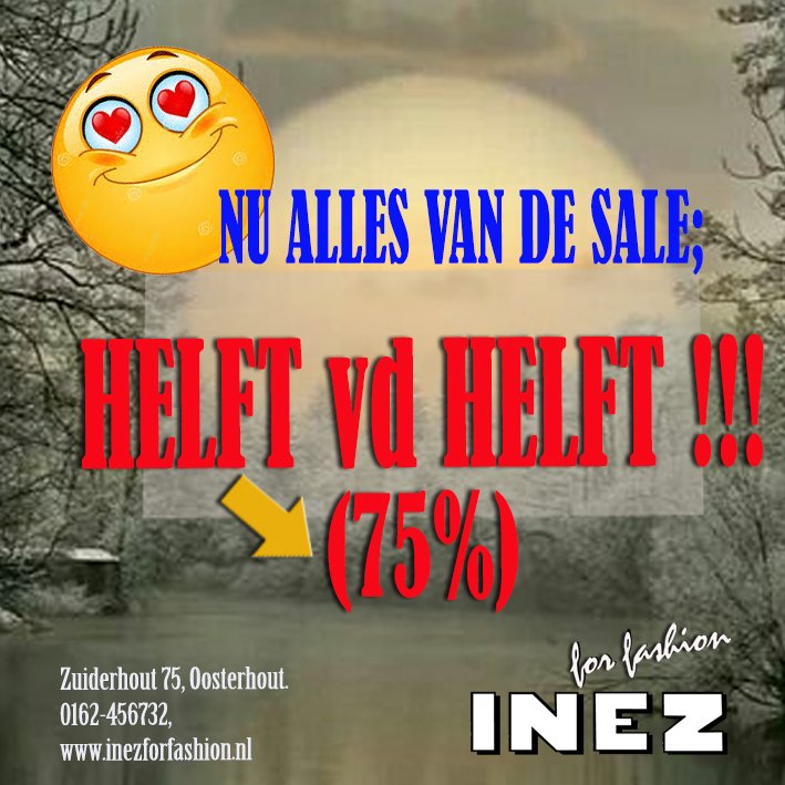 Helft van de Helft Sale! 18 februari - 15 maart Inez for Fashion Nu alles van de sale helft van de helft! (75%) bij Inez For Fashion! Lees verder Nu alles van de sale helft van de helft! (75%) bij Inez For Fashion! Zuiderhout 75, 4904 AV Oosterhout