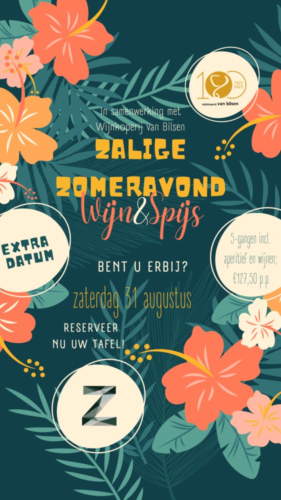Het thema van de avond houden we nog even voor ons...maar reserveren kan al wel, dan bent u zeker van een tafel! De verzorgde avond (incl. aperitief, 5-gangen menu, wijnen en tafelwater) komt op €127,50 p.p. We ontvangen u graag tussen 18:30 en 19:00 uur. Reserveer o.v.v. Zomeravond.