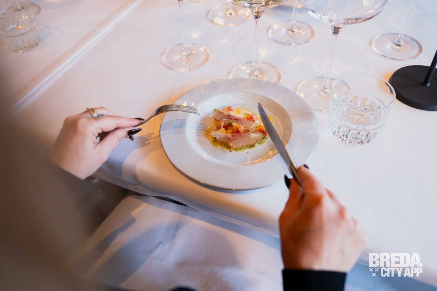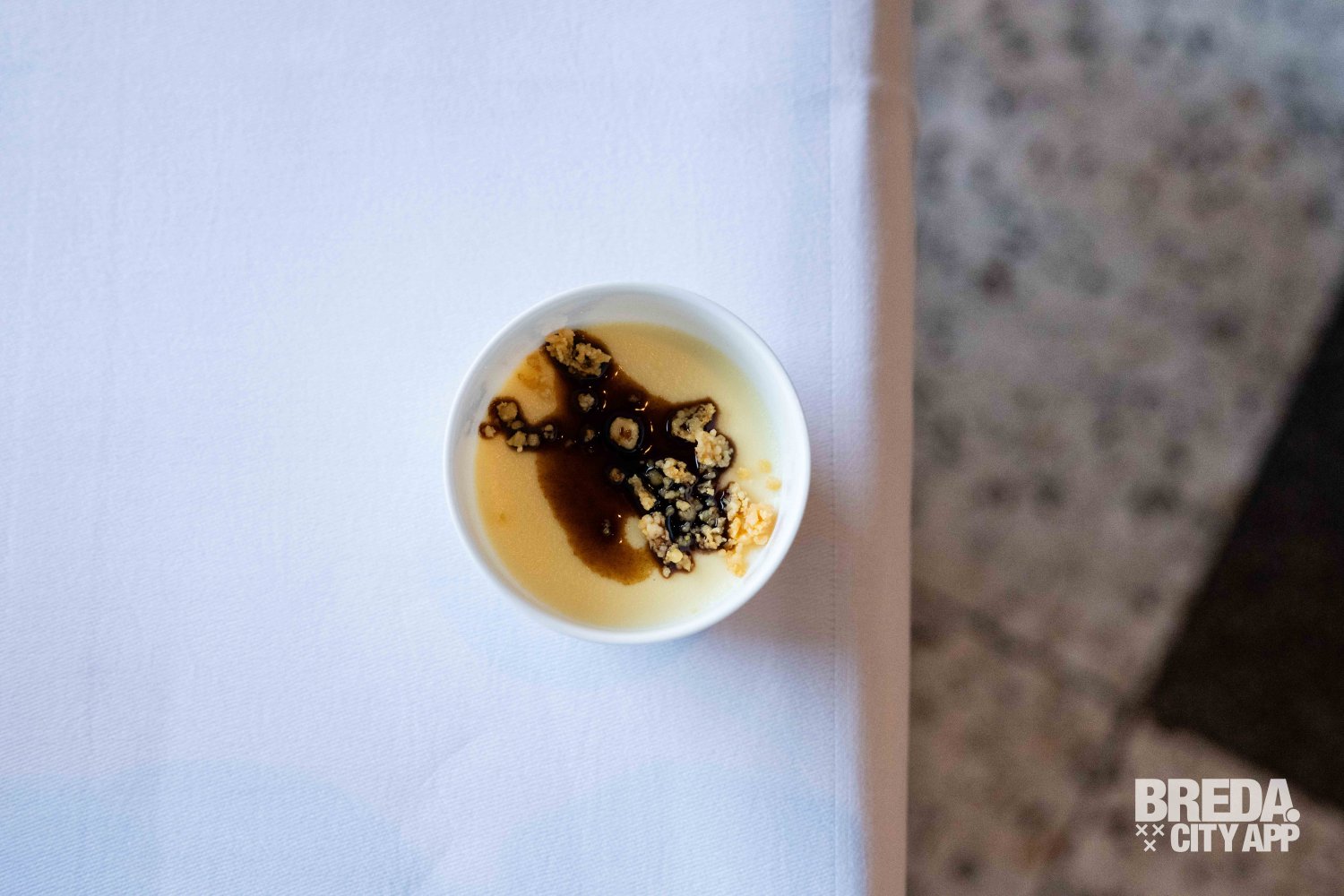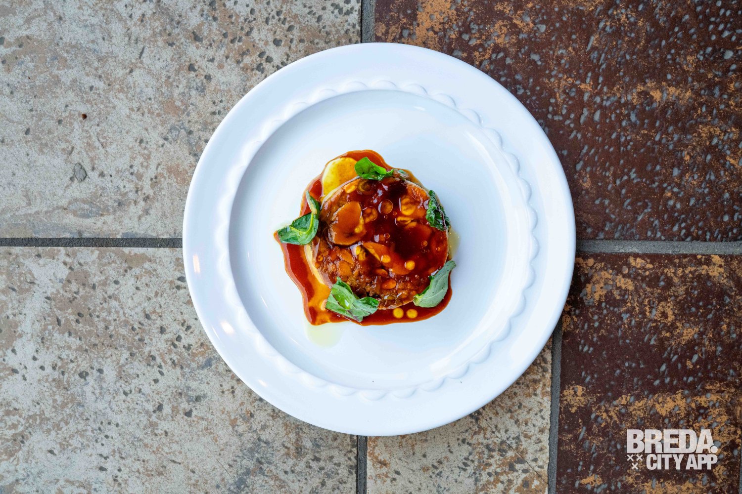 Zacht en romig van textuur, met de rijke, hartige smaak van de beroemde Italiaanse kaas. De flan smelt op je tong en de krokante toevoeging geeft een speelse crunch aan het gerecht. Een mooie start van de avond.