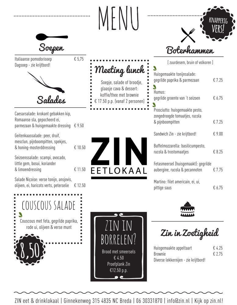 ZIN heeft een gallery, een showroom en serveert vooral een heerlijke lunch. Ze serveren zelfbereide delicatessen, maaltijden, heerlijke taarten. Ook is er de mogelijkheid om maaltijden af te halen. Daarnaast verkopen ze kado-artikelen en meubilair.