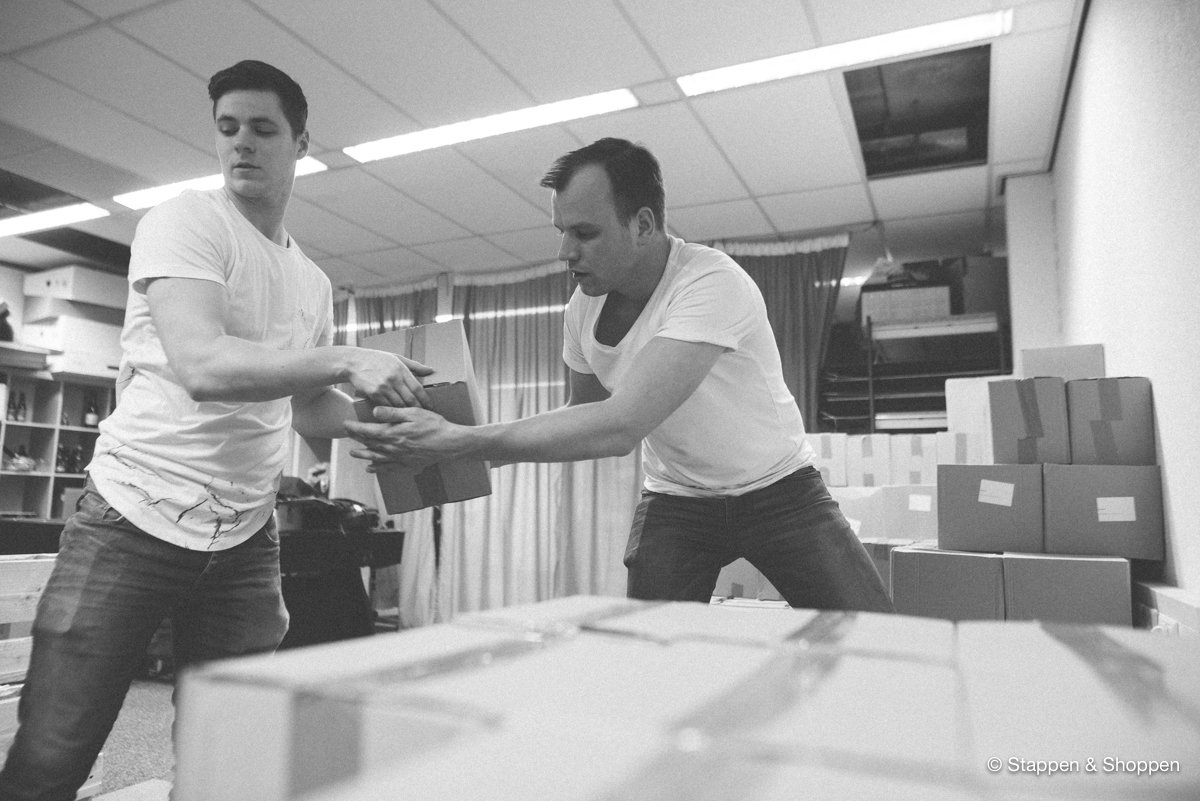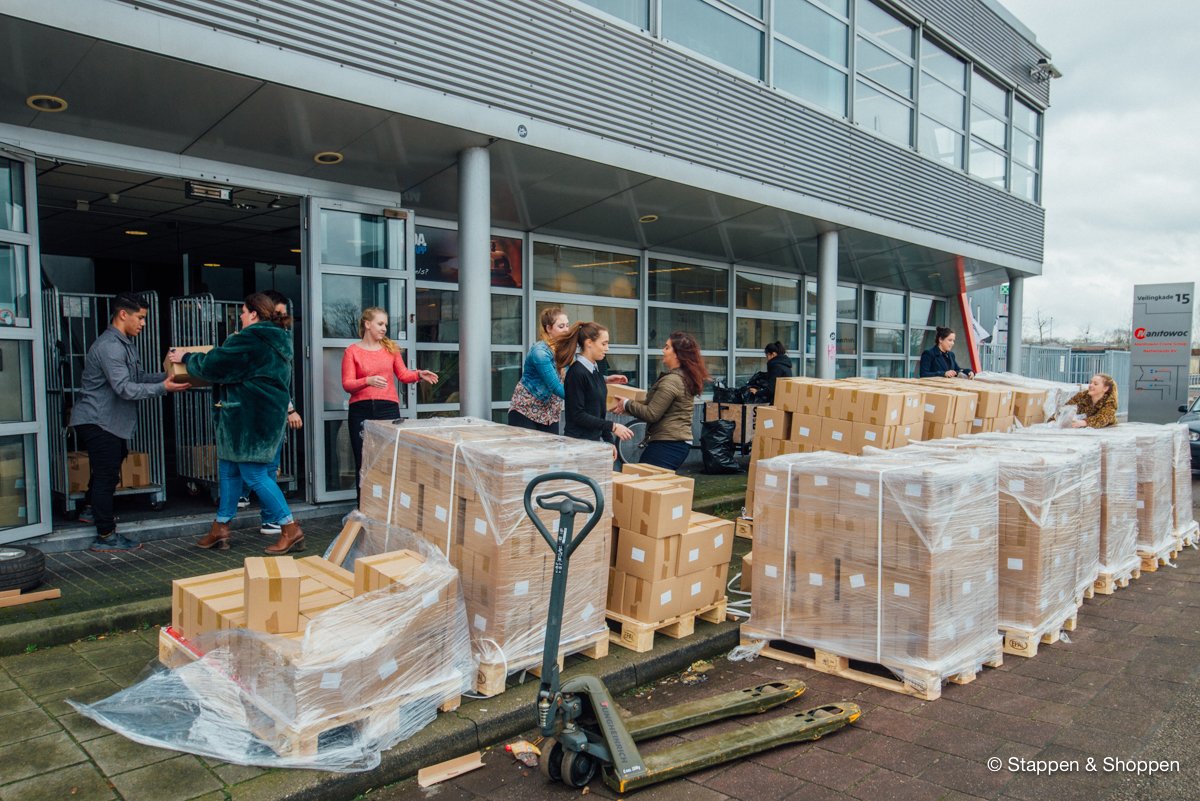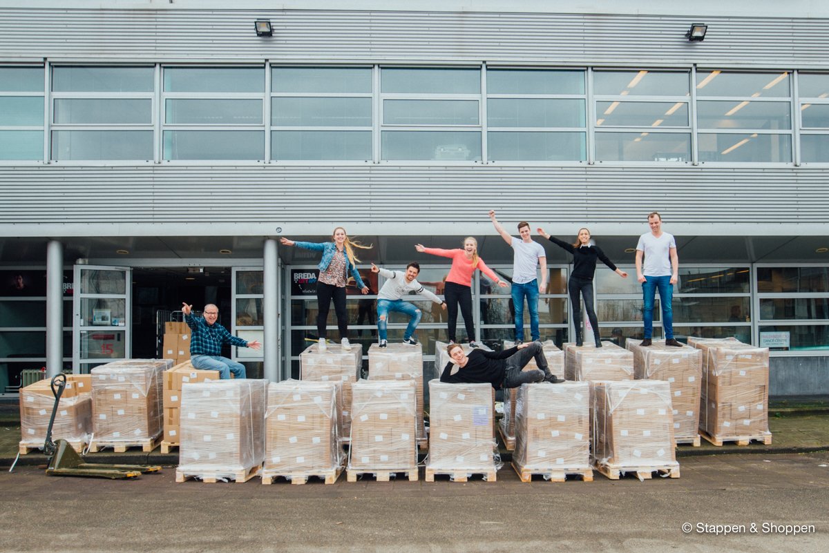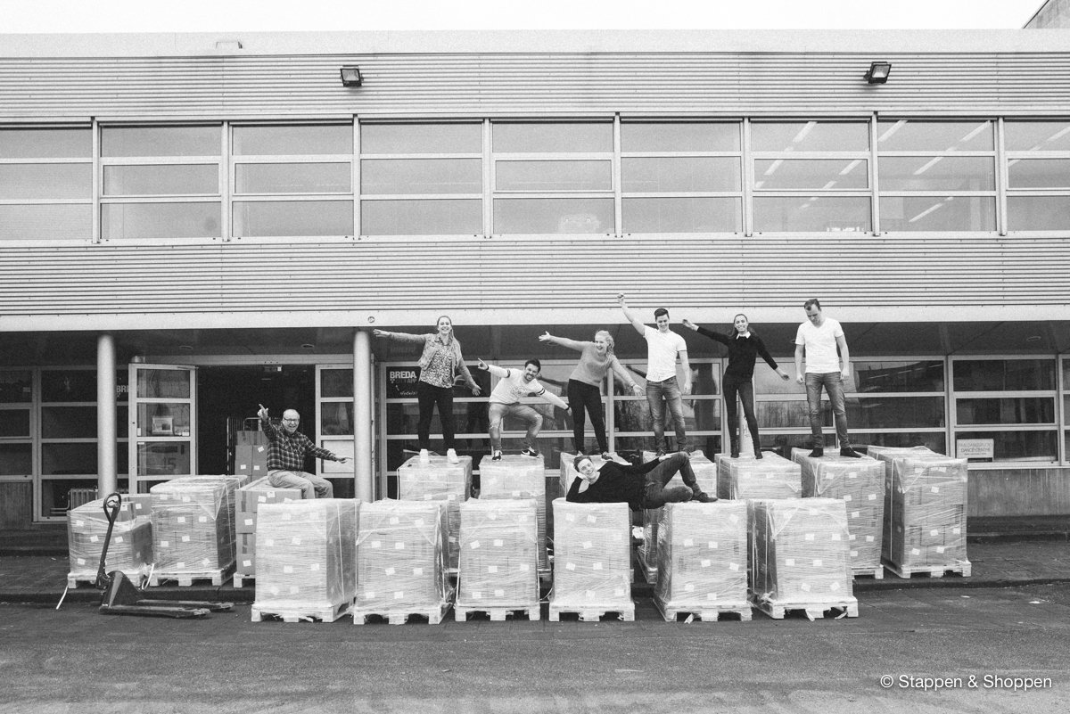 De magazines worden op 18 pallets geleverd en wegen in totaal 15.000 kilo. Elk doosje moeten we met de hand overladen en naar onze opslag achterin het pand brengen. Gelukkig maken vele handen licht werk ;)