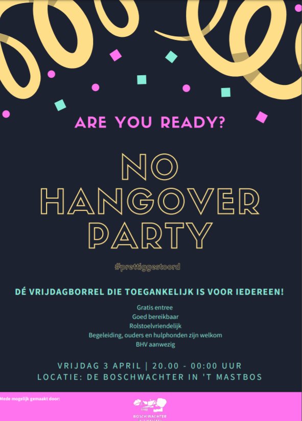 Het is niet altijd gemakkelijk voor jongeren met een beperking om na het werk met vrienden bij elkaar te komen. Door een laagdrempelige borrel te organiseren (letterlijk & figuurlijk) willen Eva en Dina deze doelgroep een mooie avond bezorgen. Restaurant de Boschwachter in ’t Mastbos heeft hun locatie aangeboden voor No Hangover Party; Zo is de avond gratis toegankelijk en daarbij is het een zeer goed bereikbare en rolstoelvriendelijke locatie.