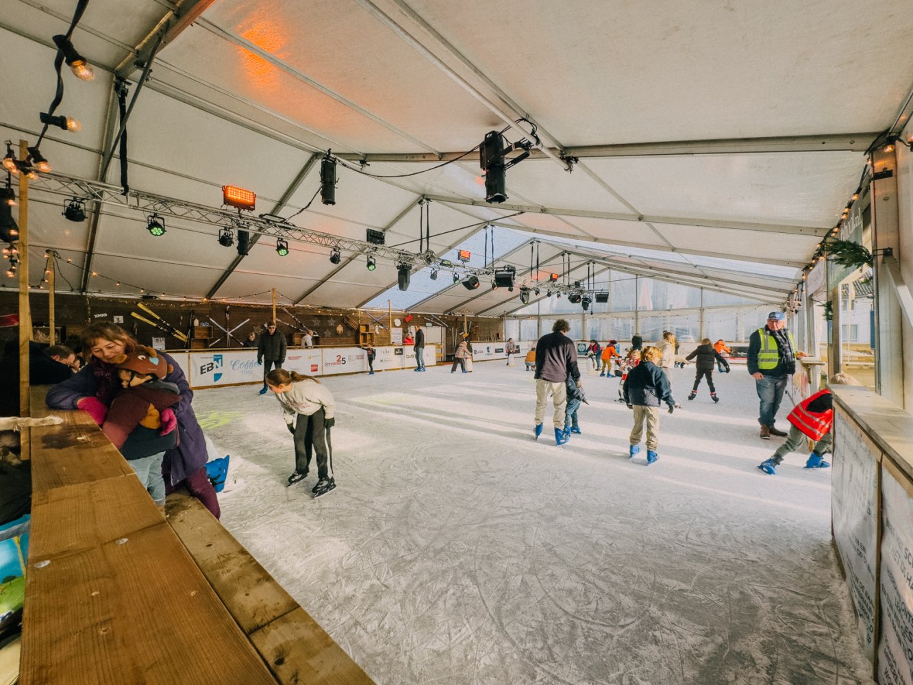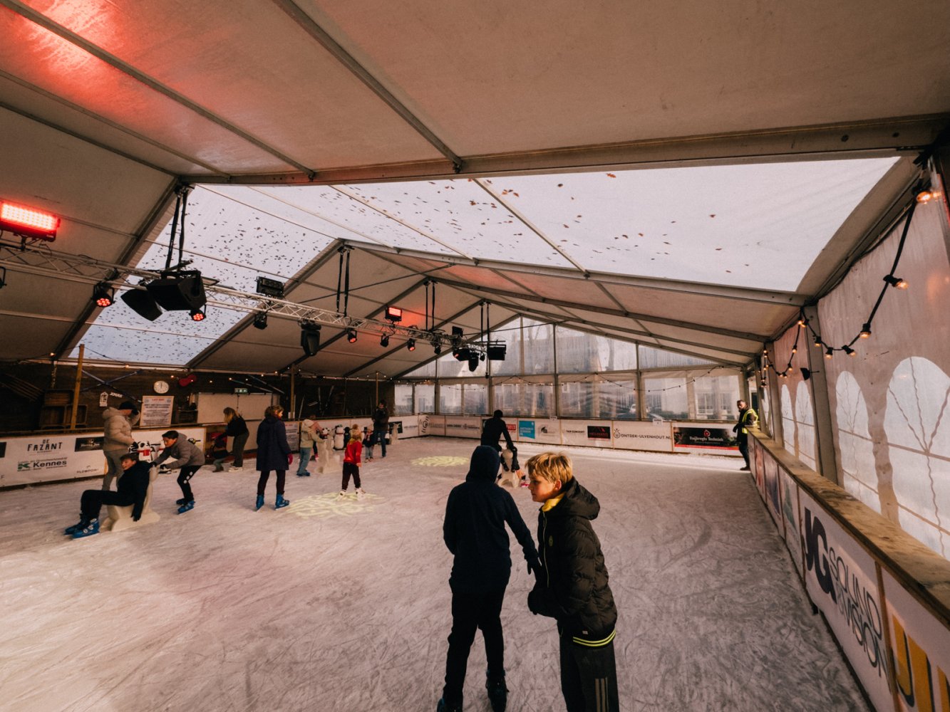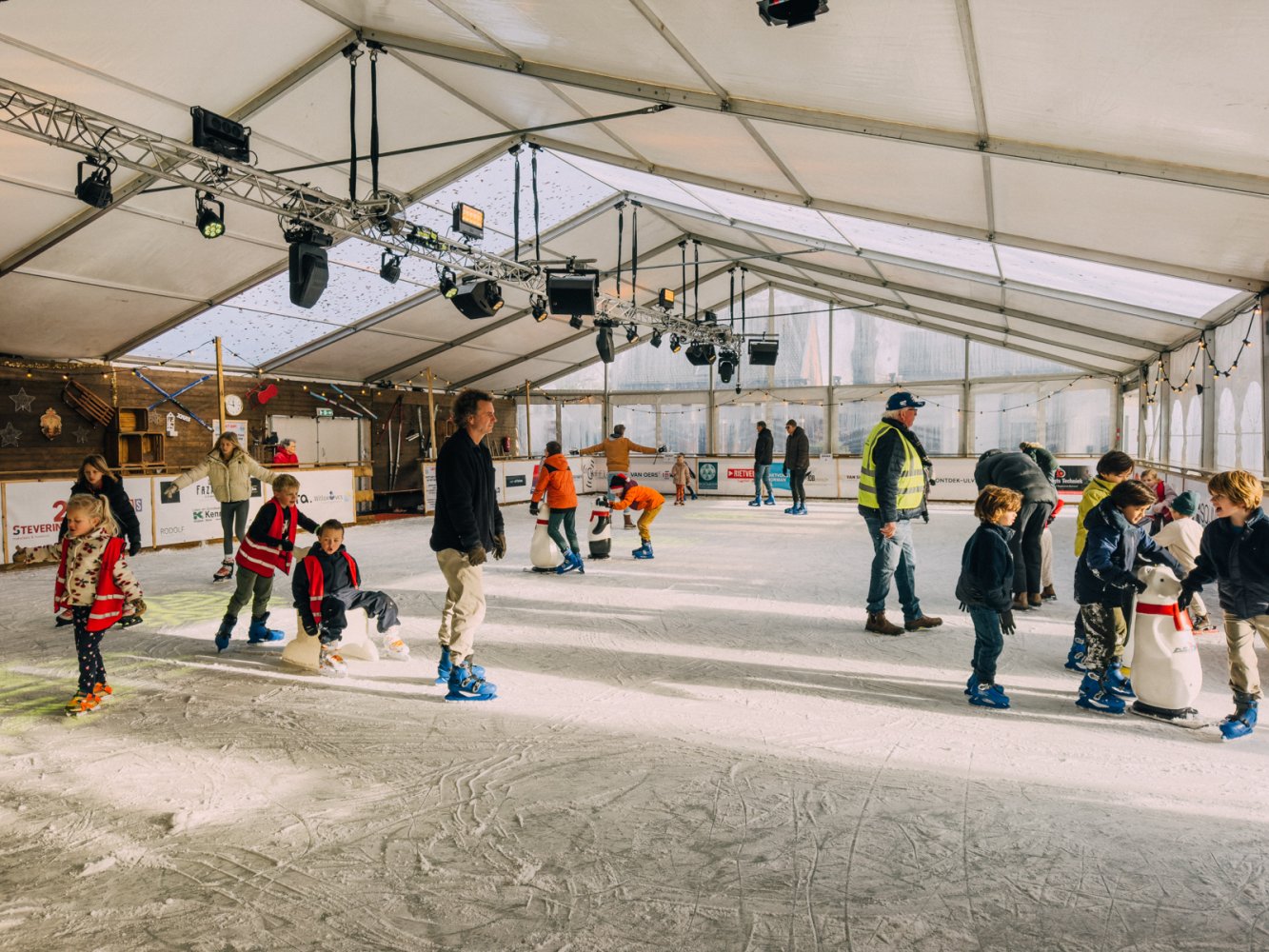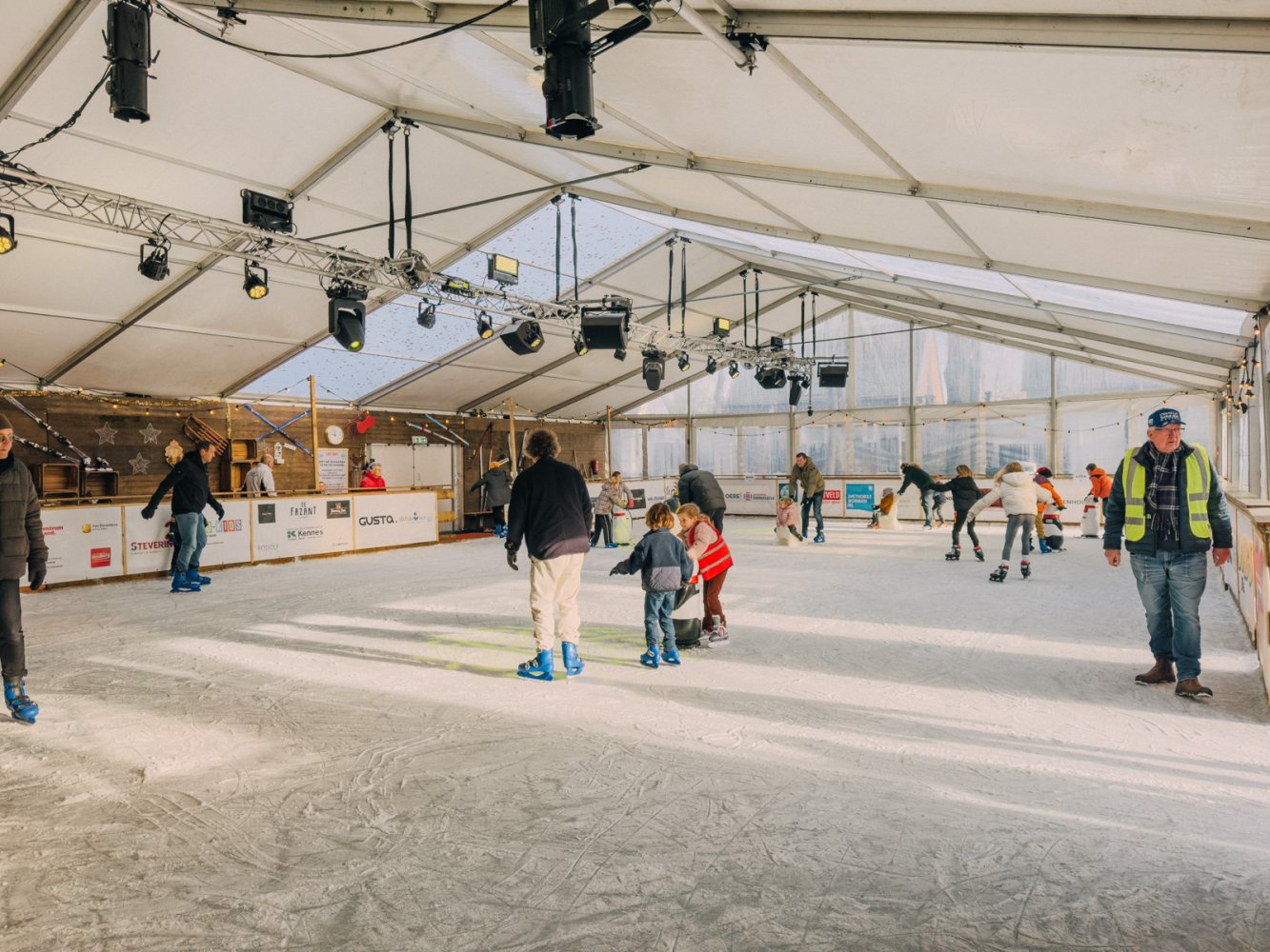 De kunstijsbaan is dagelijks geopend voor vrij schaatsen. Jong en oud kunnen hier hun rondjes draaien, via de unieke slingerende baan aan het buitenkant van de tent. Schaatsen zijn te huur en ook voor de allerkleinsten is het ijs goed toegankelijk.