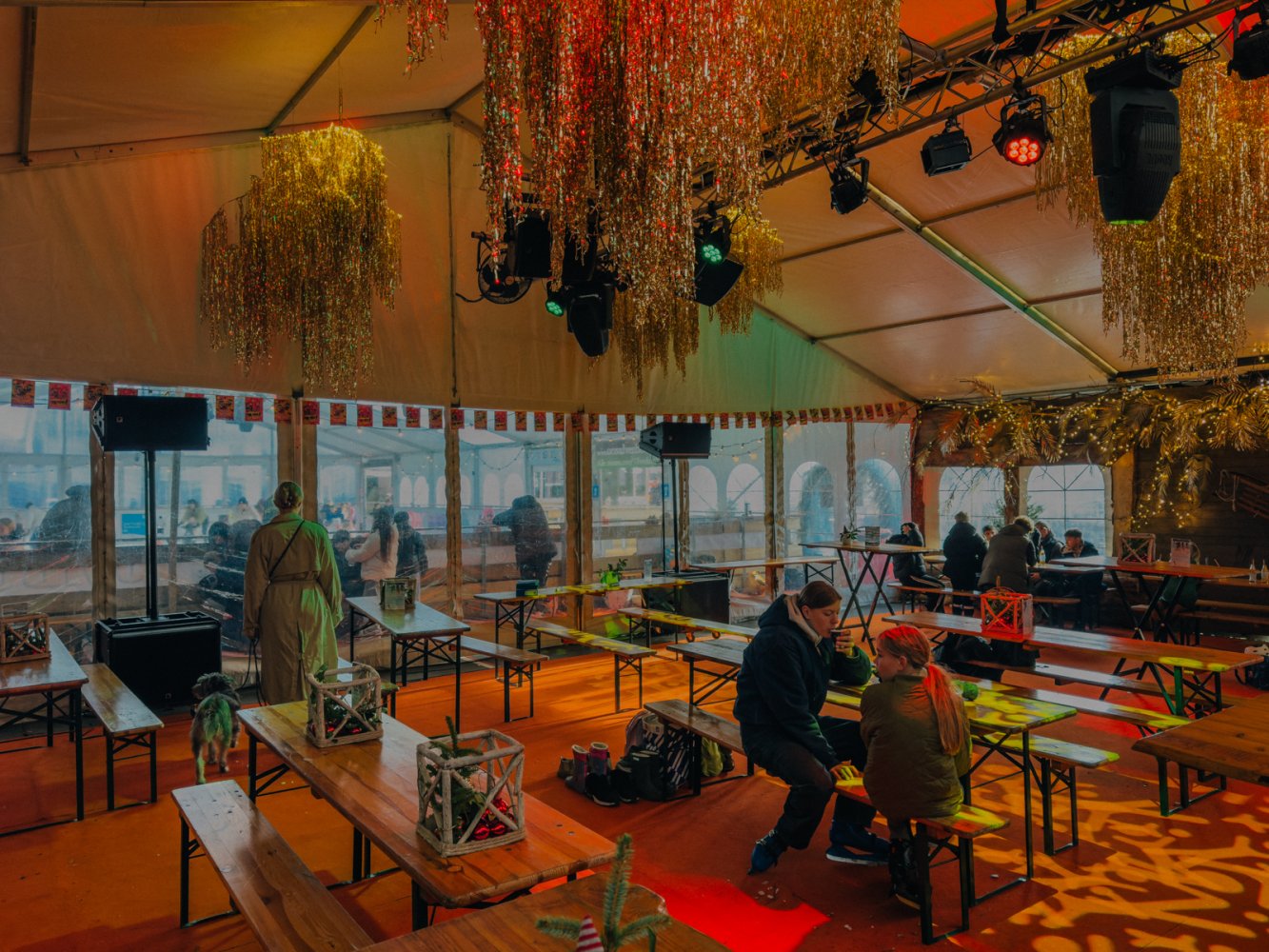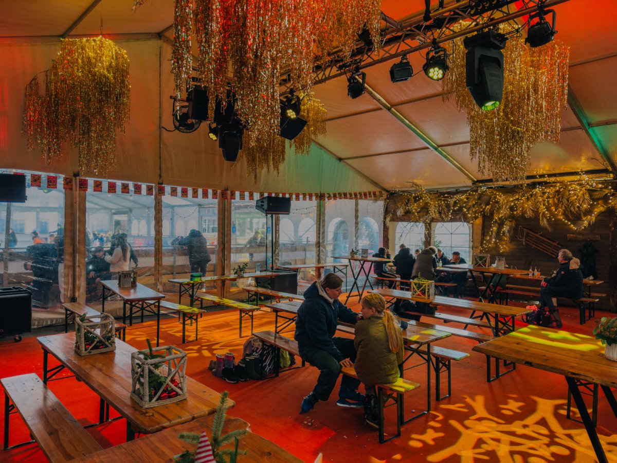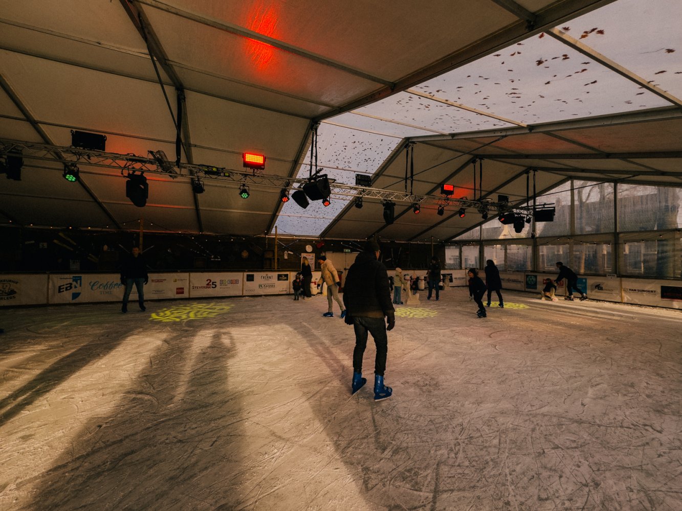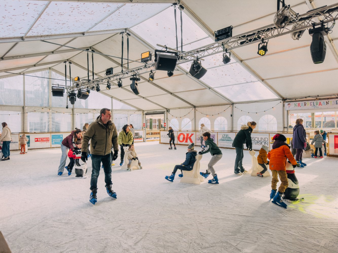 De kunstijsbaan is dagelijks geopend voor vrij schaatsen. Jong en oud kunnen hier hun rondjes draaien, via de unieke slingerende baan aan het buitenkant van de tent. Schaatsen zijn te huur en ook voor de allerkleinsten is het ijs goed toegankelijk.