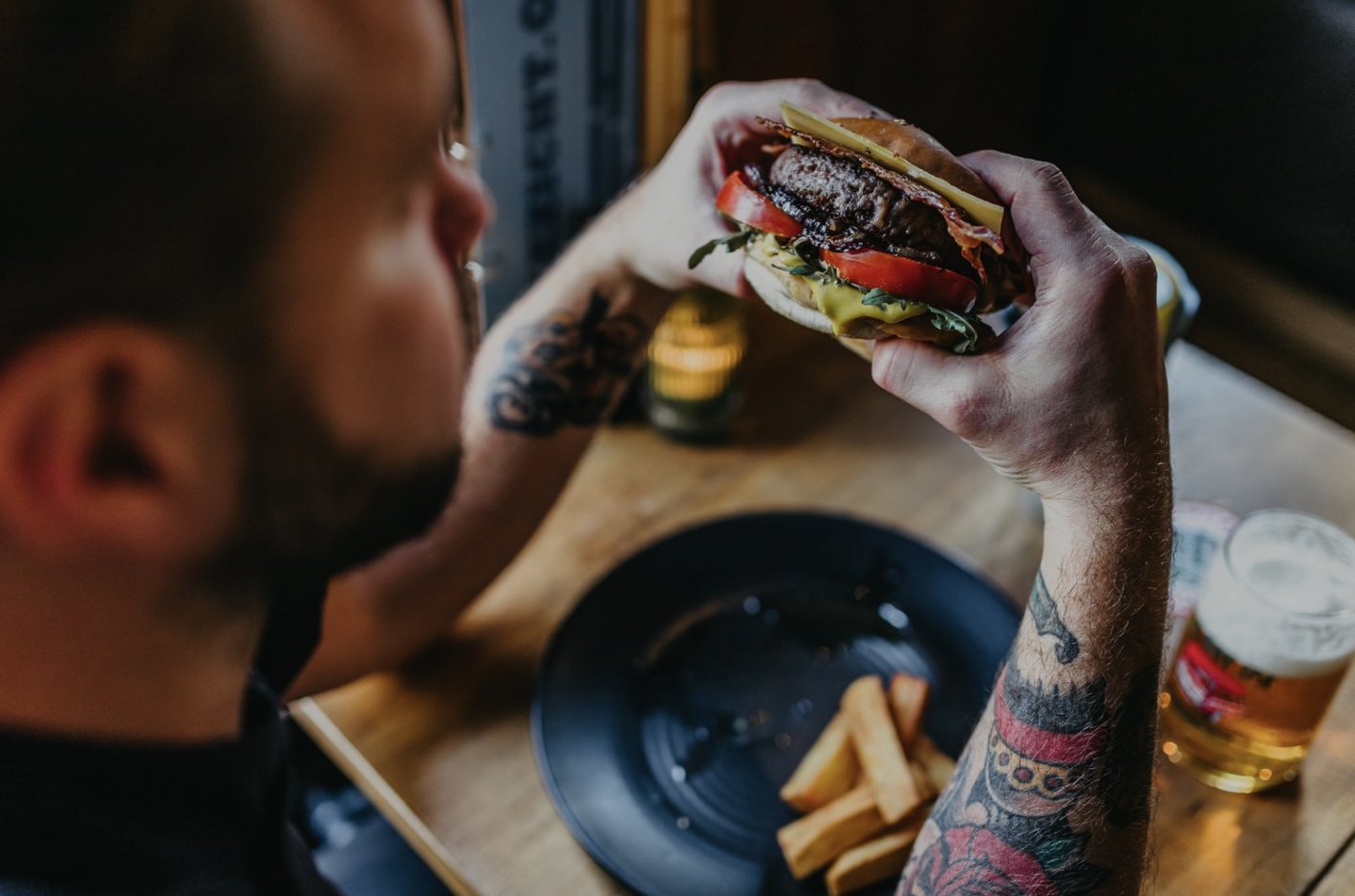 Runderburger | Bacon | Cheddar | Sla Tomaat | Uienchutney | Brioche bun | Burgersaus